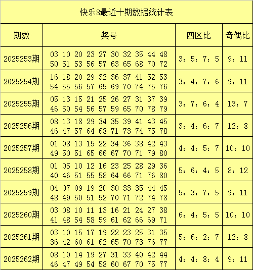 称心8第2025262期开出奖号:08 10 14 19 27 31 33 40 42 44 46 47 49 54 58 60 67 70 75 77,其中奖号和值为871,跨度为69,012路比为6:9:5,四区比为4:4:8:4,奇偶比为9:11。