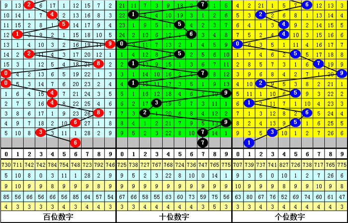 0路号码上期开出2个,近10期共出现13个发达相对活跃,其中0开出4个、3开出3个、6开出2个、9开出4个,本期应属目0路号码回补,参考号码6。