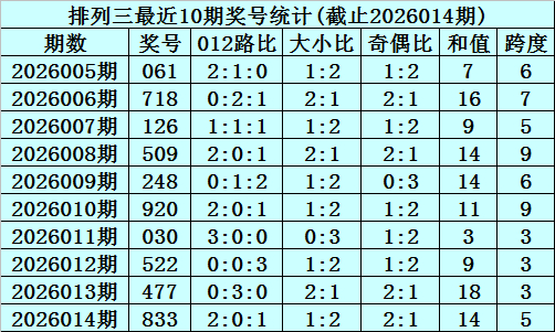 上期总结:胪列三2026014期奖号为833,奇偶比为2:1,大小比为1:2,跨度为14。