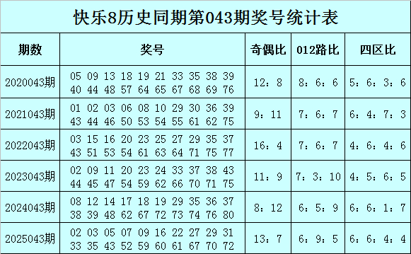 奇偶比分析:第043期历史同时奖号奇偶总比为69:51,奇数号码走势较热,昨年同时奖号奇偶比开出13:7,本年第043期把稳奇偶号码走势均衡,看敬爱偶比10:10。